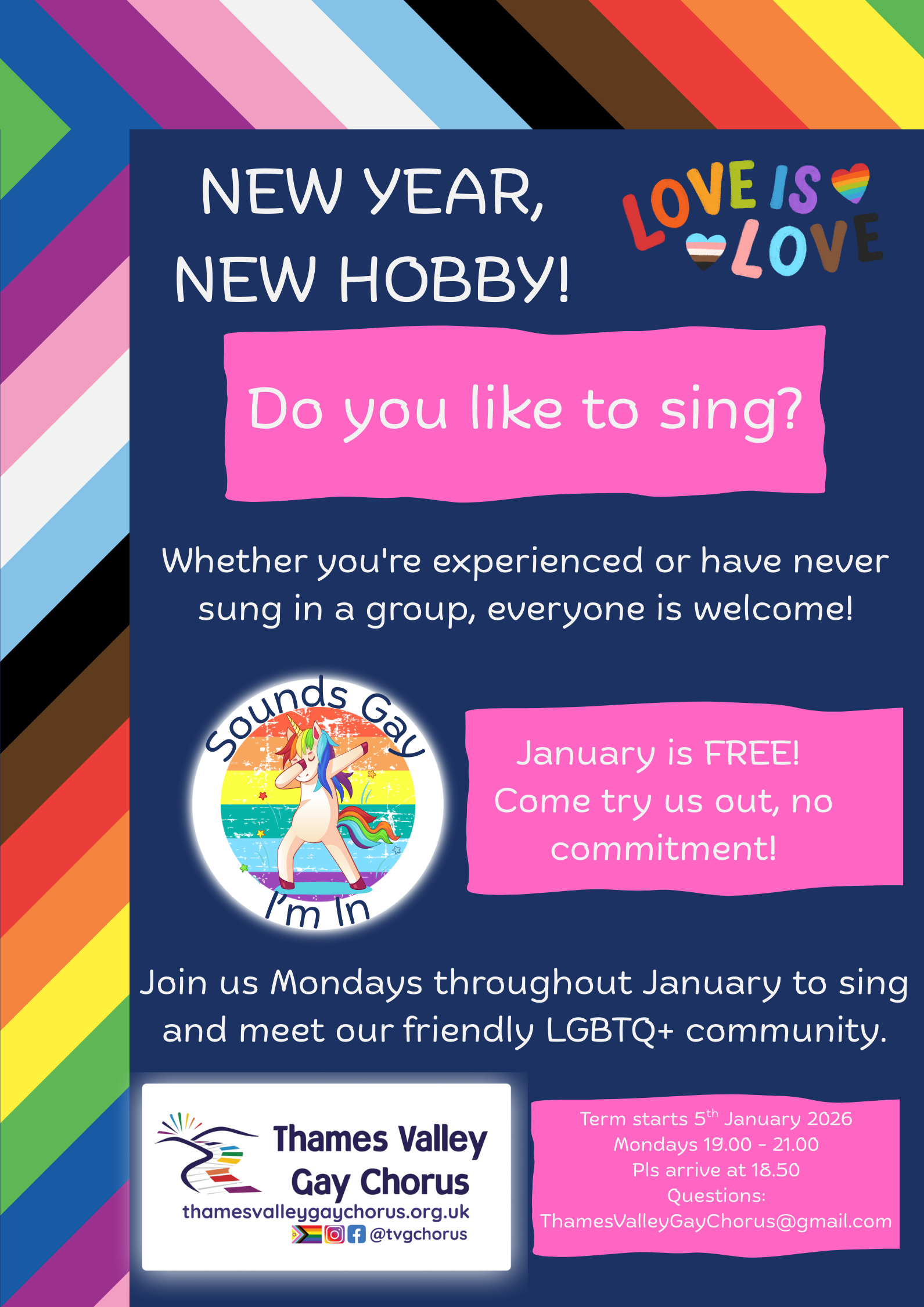 We don’t hold auditions to join and voice part is based upon your vocal range and not upon your gender. In January and September, we offer free membership all month for new joiners. At other times, you are welcome to come to 2 free taster rehearsals so you can get a feel for the choir before signing up as a regular member Read more about TVGC.